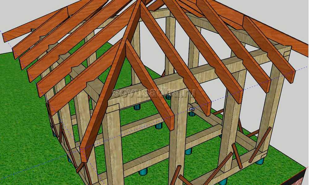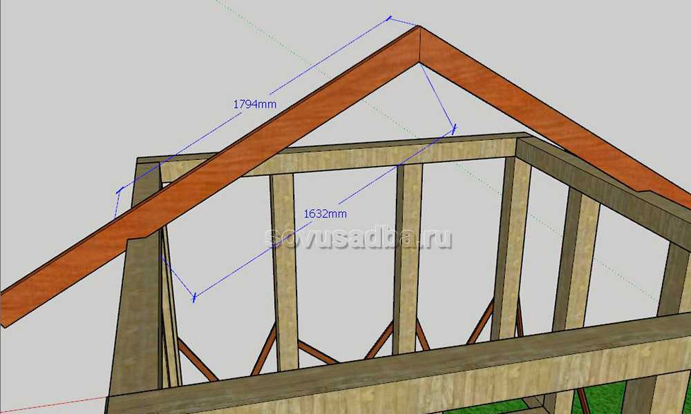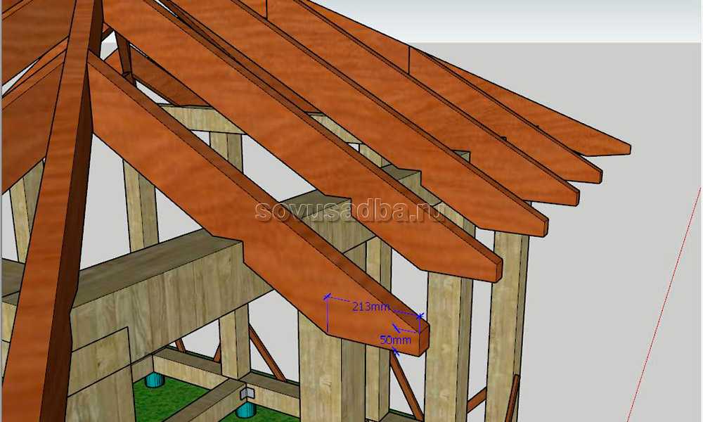 Для создания двускатной крыши используются 6 стропил с размерами 100 на 50 мм.