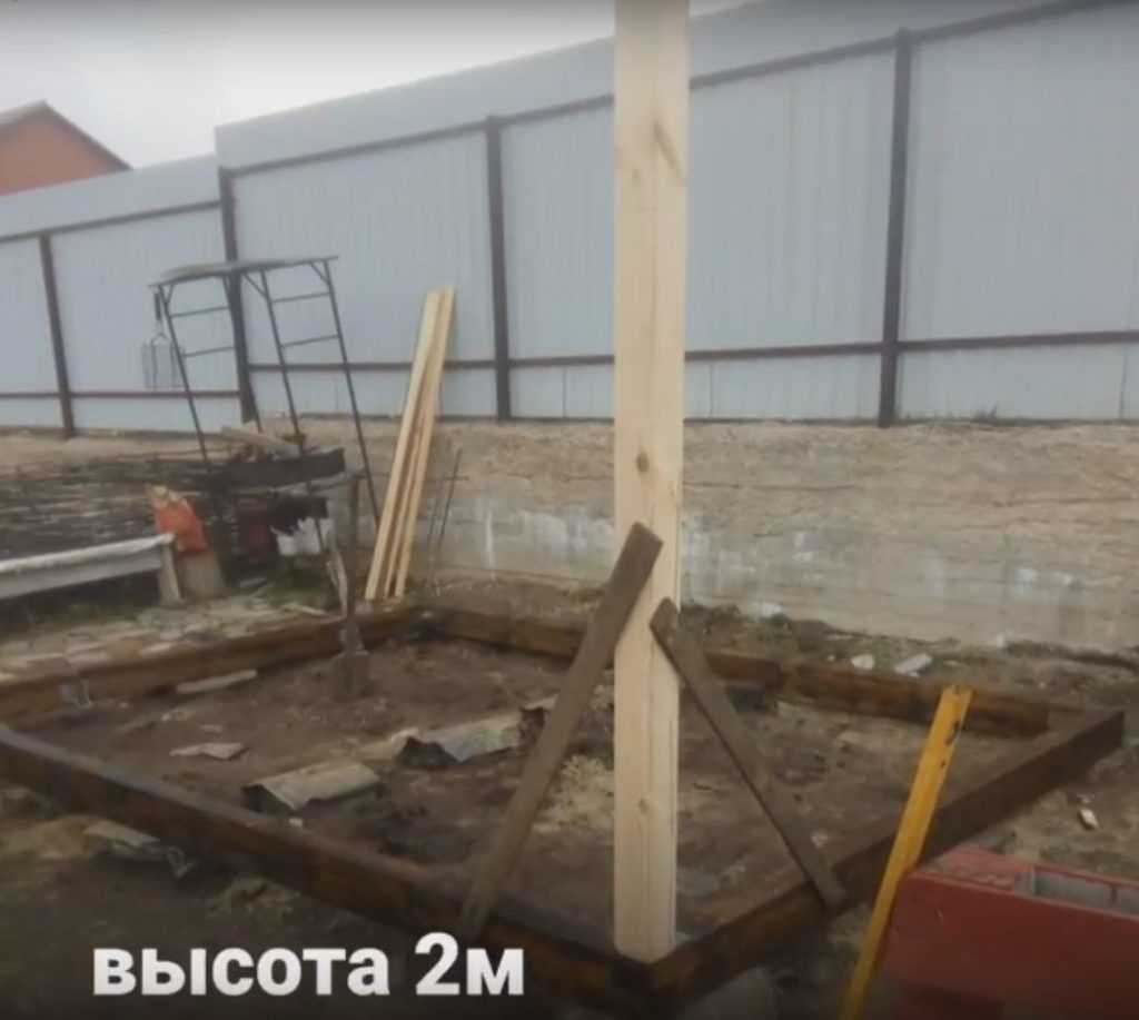 Работы со сваями остались позади, но чтобы построить своими руками беседку из профилированного бруса, одного лишь основания мало. Теперь бы организовать на нем приличный навес, а для этого нужны стойки. Потому вдохните побольше воздуха и продолжайте работать дальше.