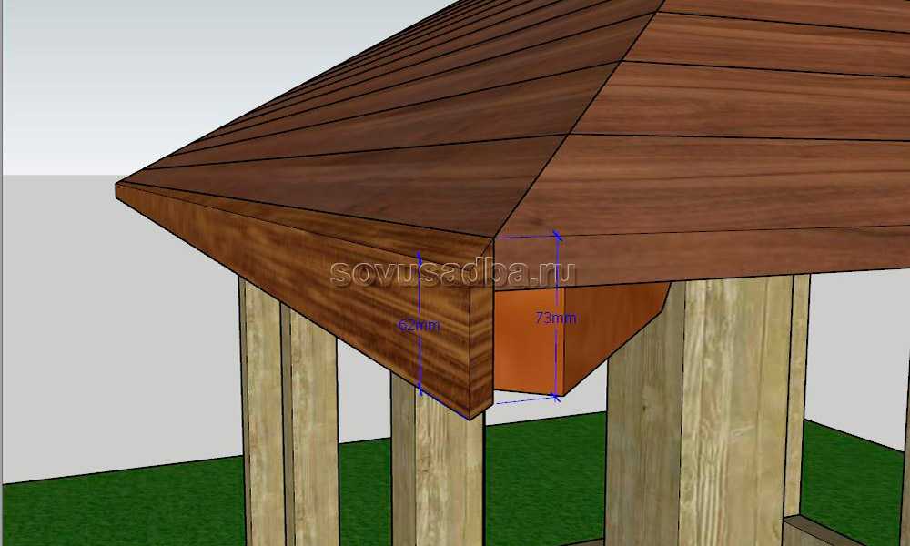 Есть несколько особенностей укладки стропил. Если длина одной балки превышает 2 м, то требуется использовать более прочные брусья, размером 100х50 мм. Для увеличения устойчивости стропила укладываются на ребро. Покрытие из поликарбоната необходимо укладывать на обрешетку, чтобы оно не провисало. Не стоит забывать о необходимости укрепить рубероид или иное покрытие на крыше. При шестиуголной форме беседки основные стропила укладываются на шесть опорных столбов по углам строения, пространство между ними укрепляется планками меньшего размера по принципу решетки.