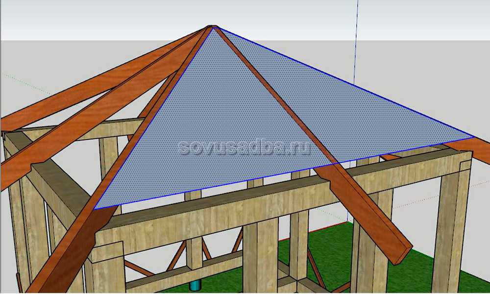 Из него видно, что диагональные стропила следует выставить таким образом, чтобы их грани лежали в рабочих плоскостях ранее построенного скелета. При этом ориентироваться нужно именно на грани, но никак не на ребро стропилины, его, как ни крути, под две плоскости одновременно не выставишь.