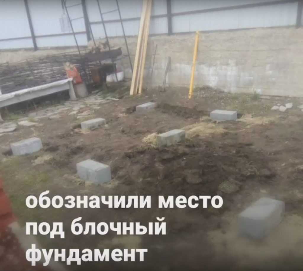 Лопатой копаем ямки, глубиной примерно 30 – 50 см. В них насыпаем песок и слой щебня. Далее все фундамент заливаем водой. Все утрамбовываем и на дно укладываем армирующую сетку.