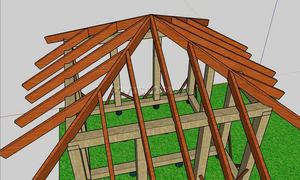 Стропильную систему крыши с верхней обвязкой, особенно при работе в одиночку, лучше предварительно собрать внизу, прямо на обвязке пола будущей беседки — так намного удобнее будет выполнять подгонку стропил и замков, а по лестнице еще успеете вдоволь «напрыгаться» на окончательном этапе сборки всей конструкции.