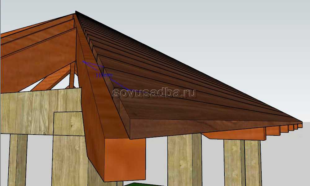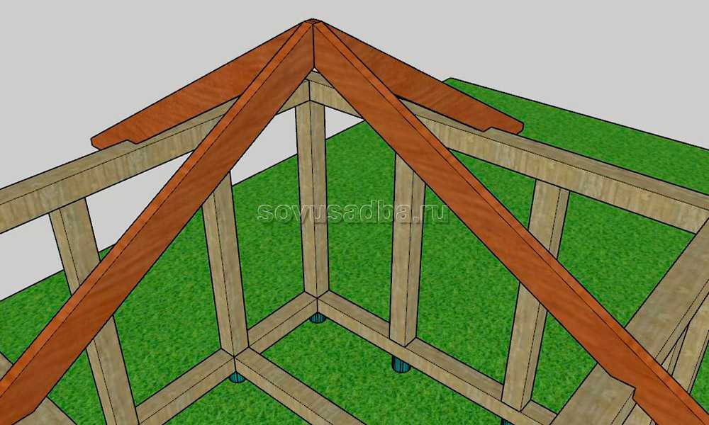 В прямоугольных беседках из бруса крышу чаще всего делают двускатной. Сложнее сконструировать покрытие для шестиугольных строений, но и такие задачи под силу старательному хозяину. В самом простом варианте стропила соединяются по принципу «в полдерева» и крепятся к основанию при помощи гвоздей или саморезов.