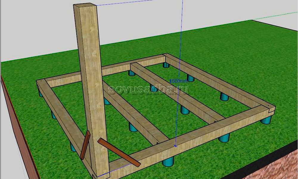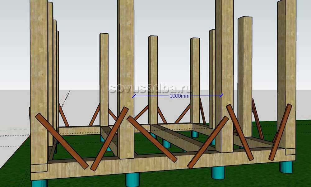 В качестве опор мы предлагаем использовать все тот же брус сечением 150х150 мм. Нарежьте его на фрагменты длиной в 1800 мм и установите сначала по углах имеющегося ростверка, а потом и над каждой закопанной сваей. Исключение следует сделать лишь для лицевого фасада. В месте входа стойки следует немного раздвинуть, формируя проем не уже одного метра.