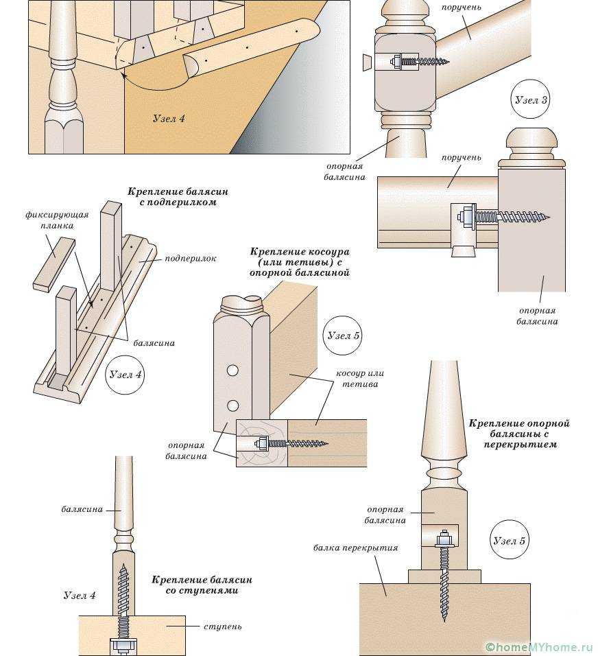 Балясину подрезают под углом, соответствующим наклону конструкции, и прикручивают саморезами к подбалясенной доске. Саморез вкручивается с внутренней стороны паза заподлицо, чтобы шляпка утопала в дереве. Вся конструкция собирается отдельно, а затем ее закрепляют с помощью клея на несущей основе.
