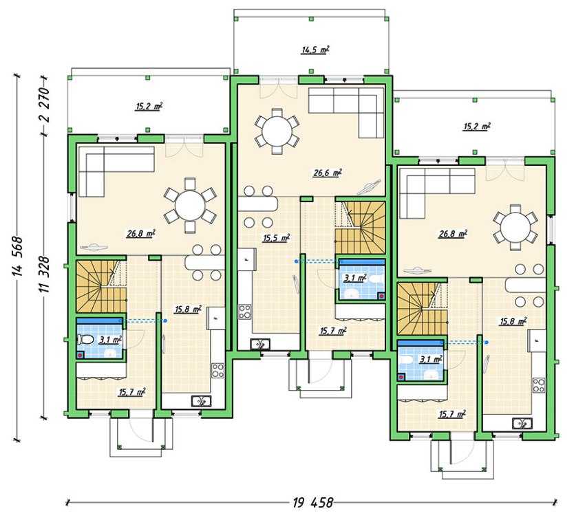 Планировка первого этажа таунхауса на две семьиИсточник pinterest.com
