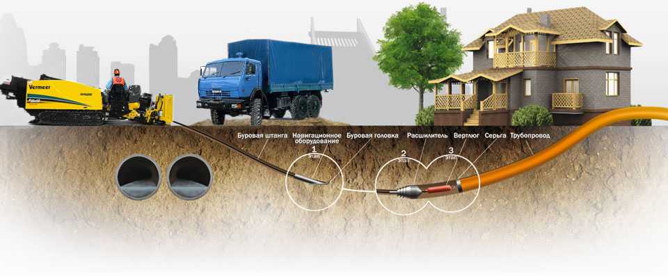 Строительство наружных подземных коммуникаций способом направленного бурения и мини прокола грунта позволяет проводить работы: