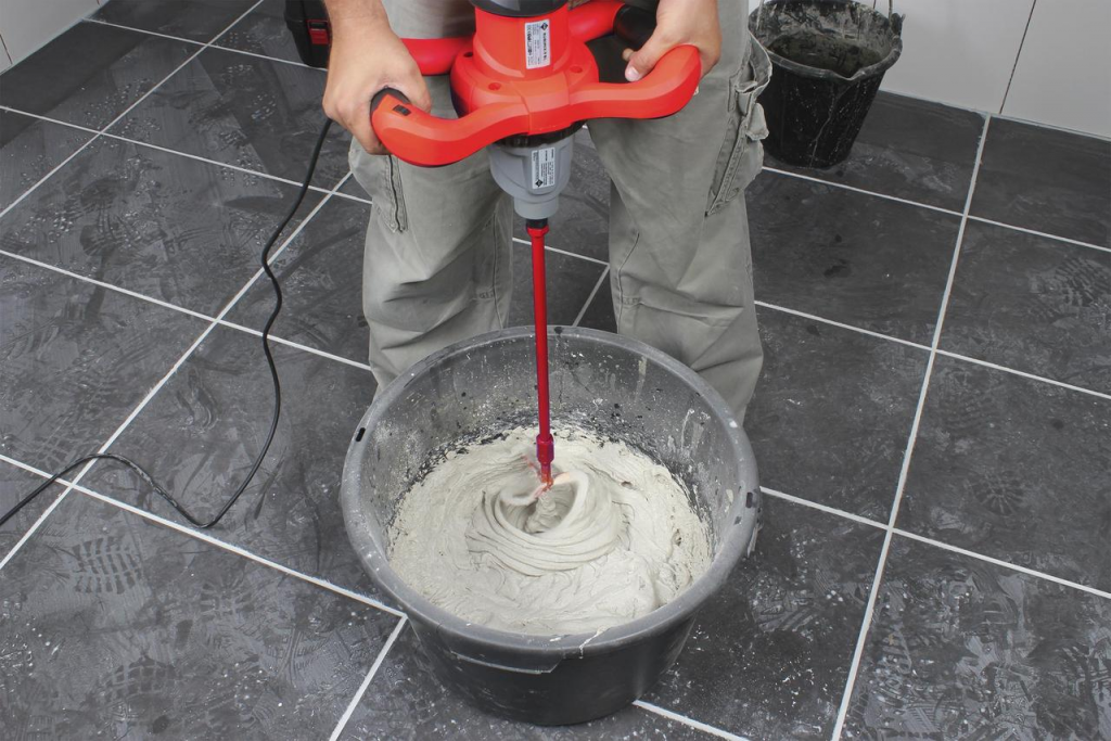 Дрель должна быть с малыми оборотами(600 оборотов в минуту). Чтобы воздух не попадал в смесь, лопасти при вращении постоянно должны быть погружены в смесь композиции.