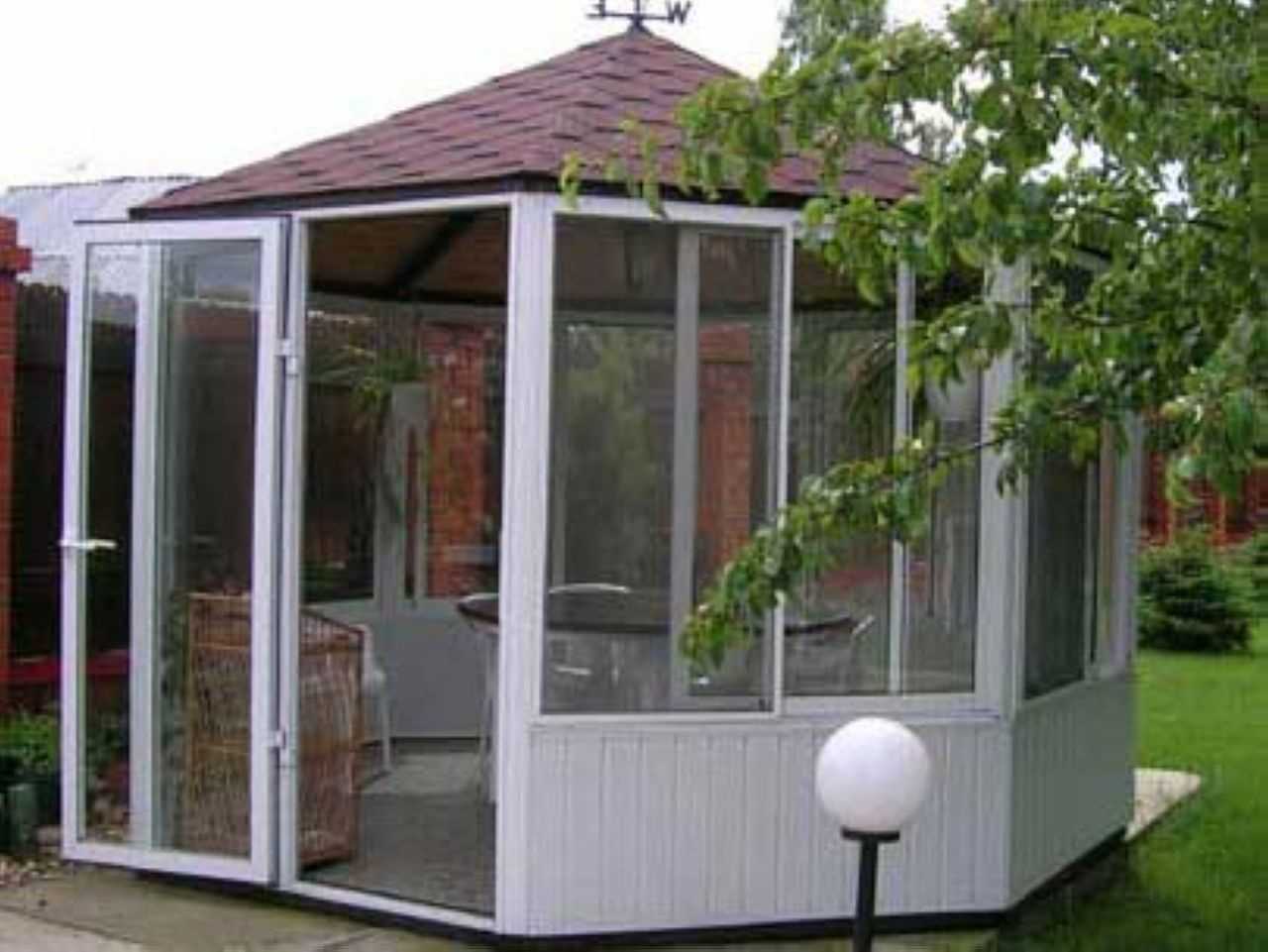 Пластик, армированный алюминиевым профилем, также используется для создания беседок. Внешне конструкция напоминает современные пластиковые окна и балконы, ее сложнее органично вписать в природный ландшафт, но и плюсы у таких беседок есть: