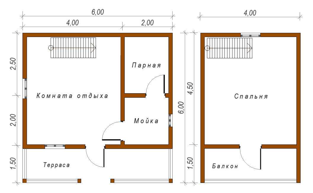 Маленькие дома от 6х6 м до 50 м2 позволяют сэкономить свободное место для огорода и просторной зоны отдыха на небольших территориях. Обычно ограничение по площади позволяет строить только одноэтажные дома прямоугольной и квадратной форм. В стандартном варианте планировка включает кухню, спальню, гостиную, санузел и небольшой предбанник.