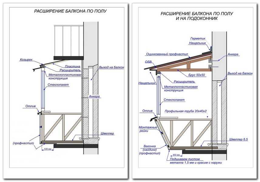 Перед закупкой необходимых материалов проводится обмер балкона, и высчитываются погонные метры металлических деталей. Все расчеты выполняются индивидуально, в зависимости от размеров балкона и на сколько он будет увеличиваться.