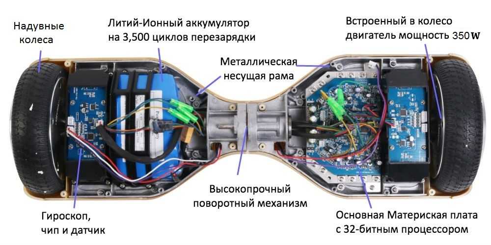 И так как мы уже сказали гироскутер имеет довольно интересный вид, состоящий из двух колес и доски или рабочей платформы, на которой стоит человек. Внутри же гиросктера есть очень умная и хитрая система балансировки, которая не дает вам упасть, когда вы на нем стоите. Но из чего она состоит?