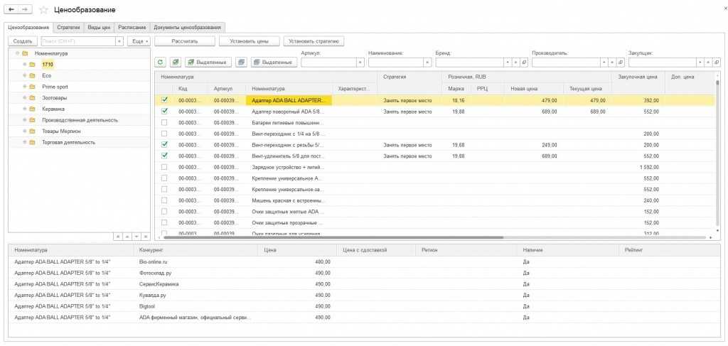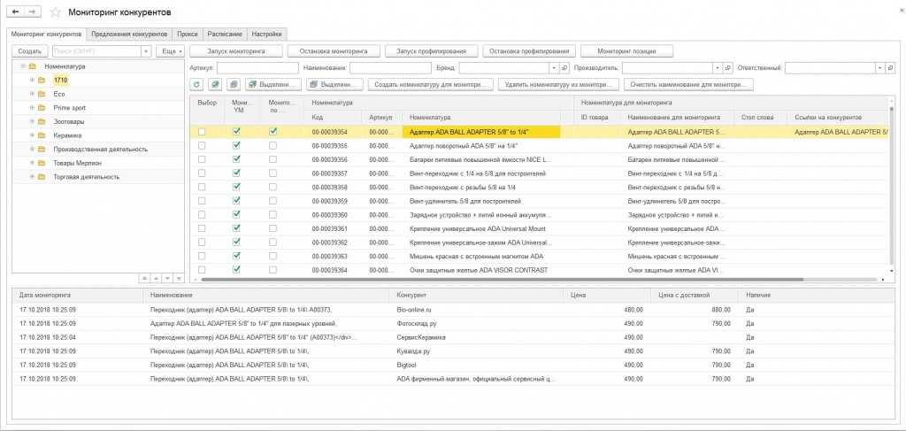 За осуществление процесса мониторинга в системе отвечает специальный модуль -«Мониторинг конкурентов», который автоматически собирает данные, по выбранным группам товаров или отдельным товарным позициям, с Яндекс.Маркет и заранее определенных сайтов конкурентов. Вся полученная информация сохраняется в информационной базе и сразу может быть использована для анализа и переоценки собственного товарного ассортимента. И поскольку система является «коробочным» решением периодические платежи за использование и любые ограничения на объемы получаемых и обрабатываемых данных отсутствуют.