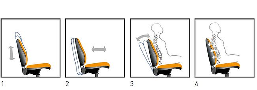 спинка должна иметь анатомическую форму, т.е. повторять изгибы позвоночника, потому предпочтение отдают моделям с подголовником и валиком в зоне поясничного прогиба. Угол наклона спинки должен регулироваться, порой настройка ведется одновременно с выставлением высоты сидения;