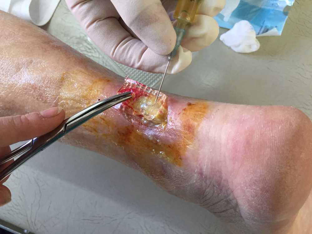 - Очищение от некротических тканей и промывание физиологическим раствором.