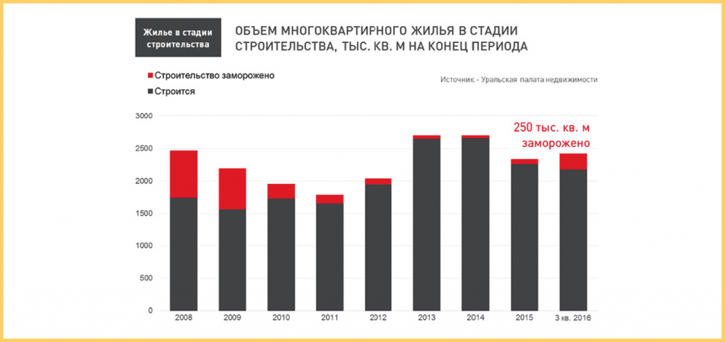 Негативные тенденции наблюдаются и на самом рынке недвижимости. Проследить их можно на примере екатеринбургских девелоперов — в 2016 году застройщики сдали всего 555 тыс. кв. м., что на треть меньше, чем в период с января по сентябрь 2015 года. О стагнации рынка красноречиво говорит следующая диаграмма: