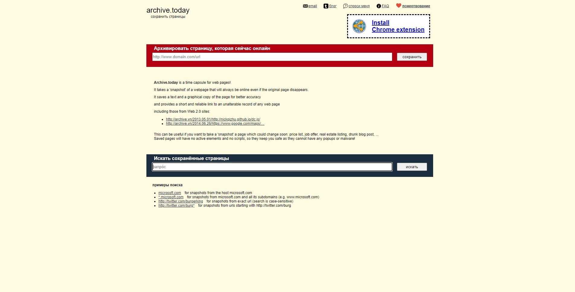 Arhive.Today — аналог предыдущего сервиса. Но в его базе явно меньше ресурсов, чем у Wayback Machine. Да и отображаются сохранённые версии не всегда корректно. Зато Arhive.Today может выручить, если вдруг в Wayback Machine не окажется копий необходимой вам страницы.