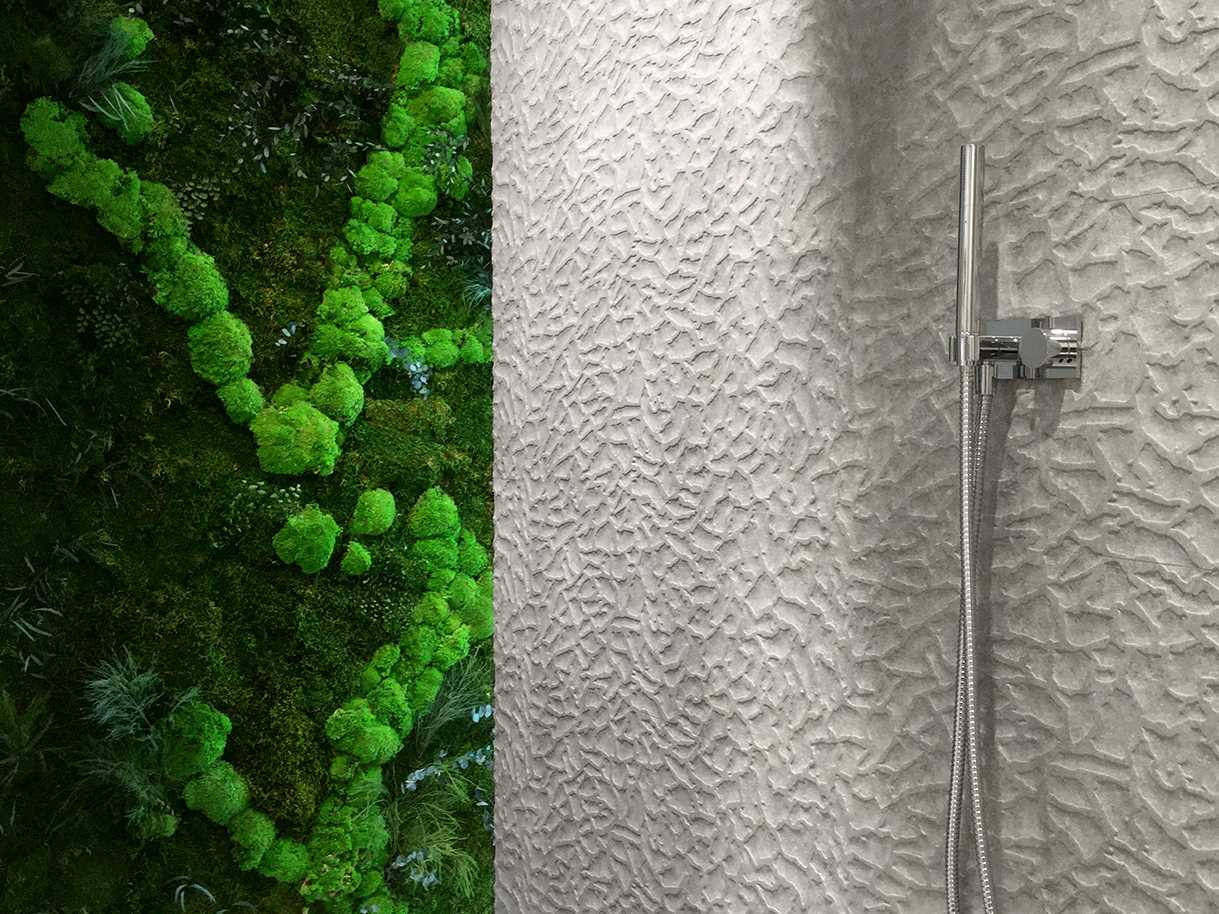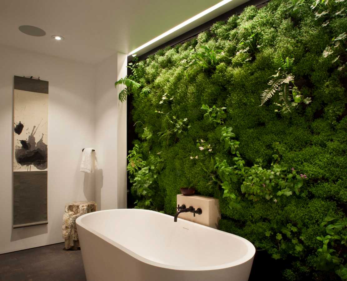 Модная тенденция последних лет — сочетание деревянной или керамической поверхности и живых растений в виде фитостен. Оно очень полюбилось архитекторами за то, что идеально подходит для современных лаконичных интерьеров, оживляя минималистичные пространства и привнося уют в интерьер. Такую «живую» стену можно сделать в любом помещении и даже в ванной комнате. Нужно только заранее предусмотреть необходимую дополнительную подсветку для растений и вывод воды для встроенной системы полива. Если вам эта идея понравилась, но вы заранее не продумали техническую сторону, то используйте искусственный мох, который по внешнему виду практически неотличим от натурального. Натуральный цвет зелени сочетается с любым цветом отделочных материалов, поэтому можете брать светлое или темное дерево, натуральный камень или однотонную керамическую плитку, и вы не ошибётесь!