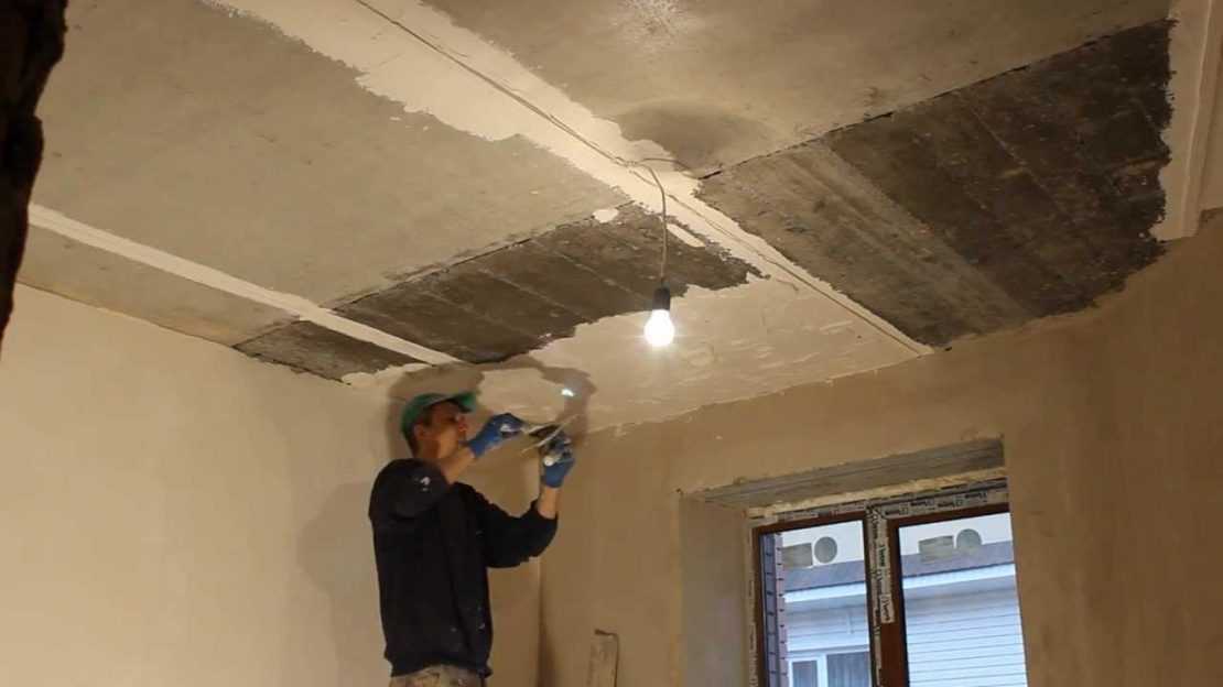 - смесь набирают на шпатель и набрасывают на потолочную поверхность, после чего разравнивают шпателем;