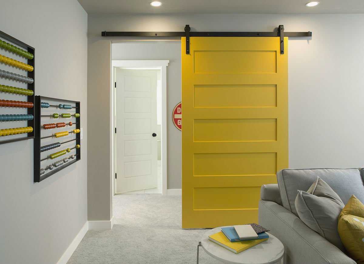 Дверные полотна в тон к стенам делают редко. Ведь стены часто оформляют с разными цветами сторон в смежных и контрастных полутонах. Но если у вас яркое и контрастное напольное покрытие, то можно оформить дверной проем под окраску стен или отличающейся на пару полутонов.