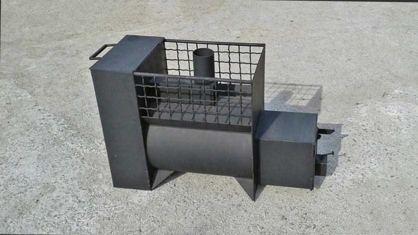 Для изготовления прибора берётся отрез трубы размером 0,8 м, зашлифовываются проёмы. Снизу устанавливается колосник. Для него годится металлический лист, достаточный для того, чтобы выкроить прямоугольник нужного размера. В материале вырезают середину, края при этом оставляют не слишком узкими. Затем приваривают прутья из металла. Готовый колосник монтируют к корпусу.