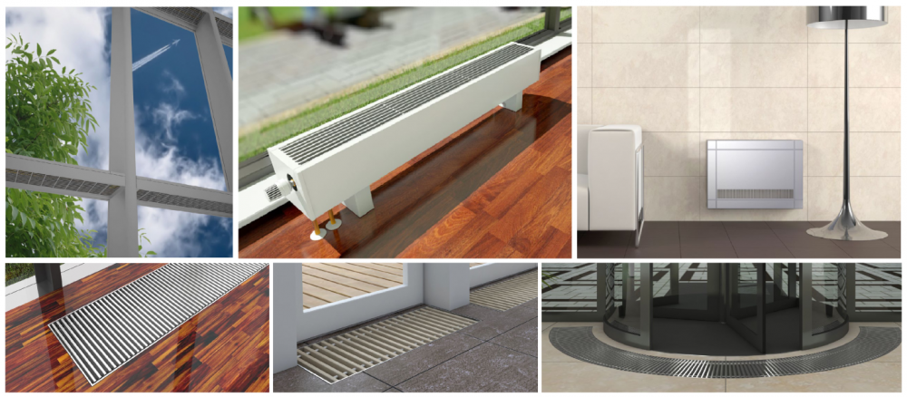- Внутрипольные конвекторы высвобождают свободное место в комнате и позволяют устанавливать их при панорамной остеклении или на террасных выходах.