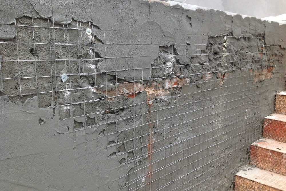Армирование сеткой под отделку. В этом случае на очищенную, загрунтованную стену крепится армированная сетка (25*25), после она покрывается шпаклевкой и облицовочным материалом.
