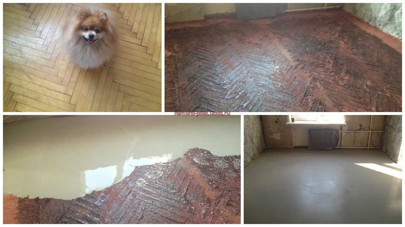 Когда старый паркет лежит на гудроне, приклеенный к бетонному основанию пола, паркет убирается, основание пола выравнивается наливным полом. Затем идет укладка напольного покрытия.