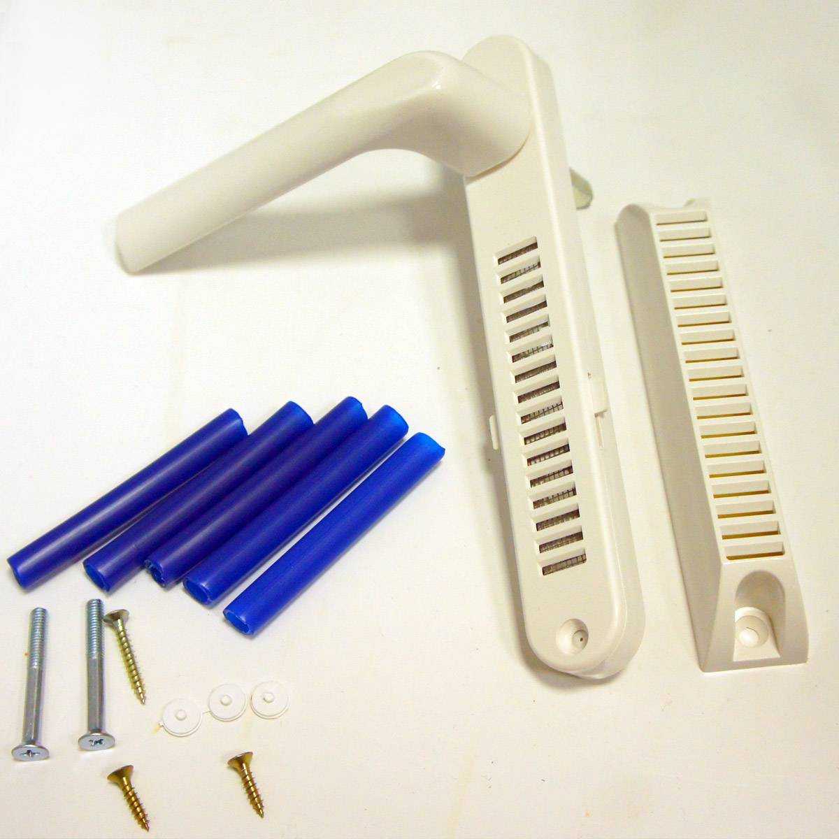 Для установки необходимо снять старую ручку, просверлить сквозные отверстия по шаблону, вставить трубки и зафиксировать части ручки. Поток воздуха регулируется задвижкой.