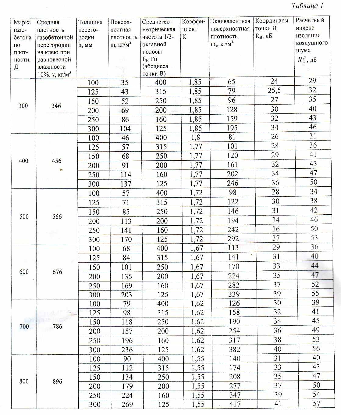 Для иллюстрации вышесказанного в таблице 1 приведены данные по звукоизоляции конструкций из газобетонных материалов марок по плотности Д600 и Д800.