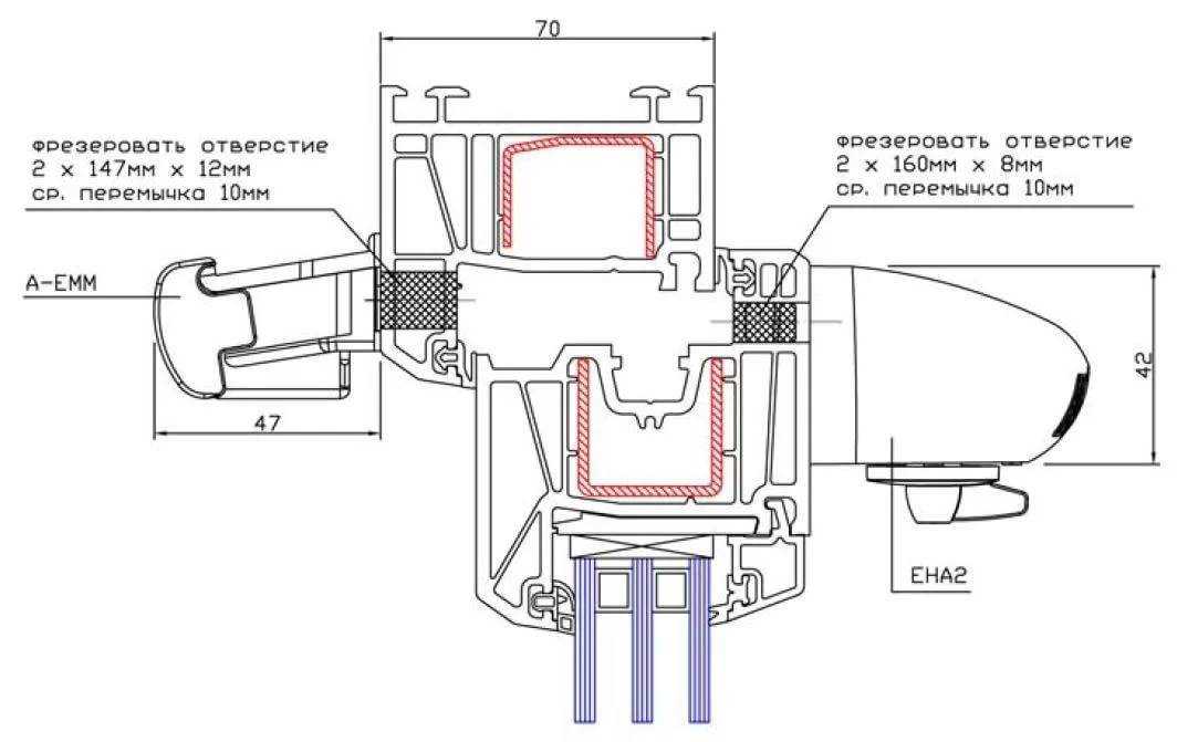Такие конструкции могут состоять из одного цельного блока или двух раздельных: один из них устанавливается на улице, второй — в помещении. Для их монтажа требуется сделать отверстия вытянутой формы в верхней части наплава створки и наплава рамы. Для этого желательно иметь шаблон.