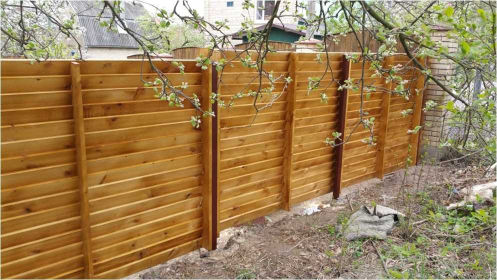 Считается наиболее дешевым вариантом. Доски монтируются горизонтально прямо к столбам на саморезы. В сплошных конструкциях дерево устанавливают по методу лесенки либо шахматки.