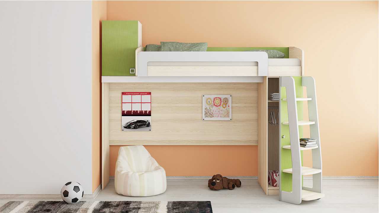Для маленьких комнат выгоден выбор кровати-чердака. Она состоит из каркаса и спального места, может быть оснащена дополнительными элементами: письменным столом, тумбой для вещей, шкафом. Чтобы лечь отдохнуть, нужно подняться по аккуратной лесенке, расположенной сбоку.
