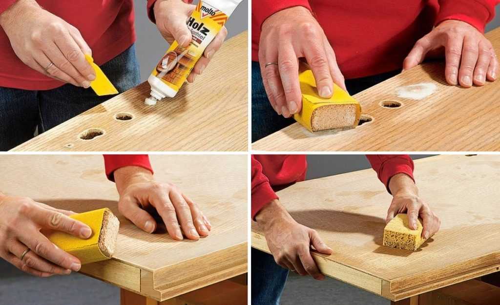 Если на поверхности дверного полотна вы обнаружили какие-либо дефекты (трещины, сколы, царапины), их обязательно нужно устранить. Сделать это можно при помощи шпатлевки по дереву. Состав наносится на поврежденный участок, резиновым шпателем вся масса разравнивается. Поверхности, покрытой такой замазкой, нужно дать высохнуть, после чего при помощи наждачной бумаги место обработки тщательно зачищается. В итоге не должно оставаться никаких неровностей или комков засохшей шпатлевки.