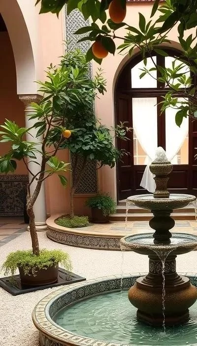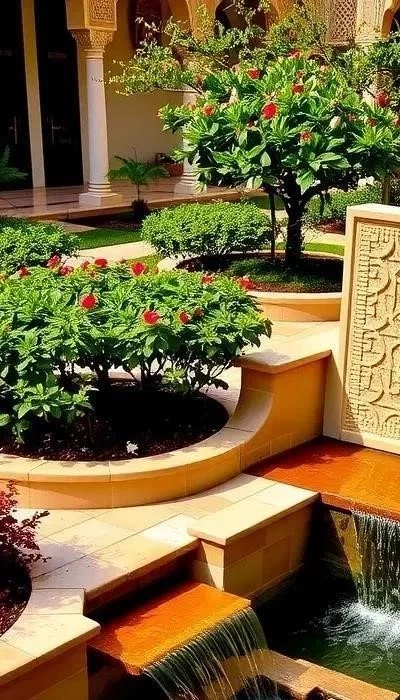 Фонтаны и водные каскады – неотъемлемая часть арабского сада. Вода символизирует жизнь, чистоту и благополучие. Звук журчащей воды создает успокаивающую атмосферу и помогает расслабиться. Фонтаны могут быть разных форм и размеров, от простых бассейнов до сложных каскадов с декоративными элементами.