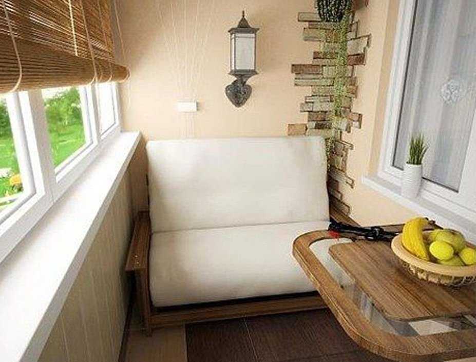 Важно выбрать правильную форму и размер, чтобы максимально использовать площадь. Чаще всего устанавливают небольшой столик и один-два стула, небольших кресла