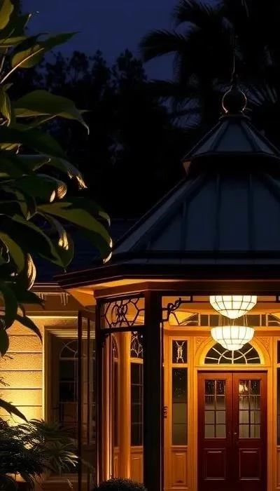 Экзотические растения – неотъемлемая часть стиля ар-деко. Пальмы, бамбук, юкки, драцены и другие растения с необычной формой листьев и яркими цветами создают атмосферу экзотики и роскоши. Важно выбирать растения, которые хорошо сочетаются друг с другом по цвету и форме, создавая гармоничную композицию. Декоративное освещение играет ключевую роль в создании атмосферы таинственности и гламура. Используйте светильники с геометрическими формами, чтобы подчеркнуть архитектурные элементы сада и создать эффектные световые акценты.