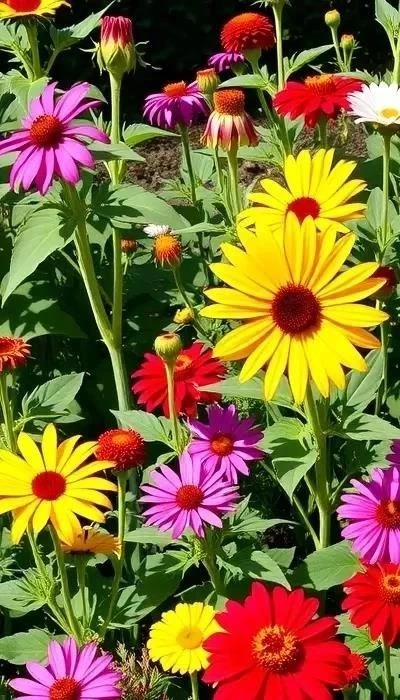 Примерный список растений: Лаванда (солнце, сухая почва), Эхинацея (солнце, умеренно влажная почва), Рудбекия (солнце, любая почва), Флоксы (солнце, влажная почва), Петуния (солнце, умеренно влажная почва), Бархатцы (солнце, любая почва).