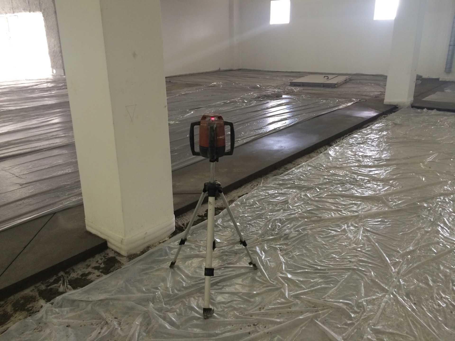 Подготовительные работы такие же, как и описаны выше: найдите самую высокую точку и от нее установите минимальную толщину будущей стяжки. Не забывайте приплюсовывать размеры остальных элементов финишного покрытия пола, так его поверхность займет проектную нулевую отметку