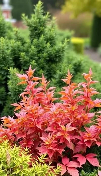 Примеры сортов: Кизильник блестящий ‘Red Leaf’ (красные листья), Дерен белый ‘Sibirica’ (яркие красные побеги), Пузыреплодник калинолистный ‘Diablo’ (темно-бордовая листва). Выбирайте сорта, соответствующие вашим предпочтениям.